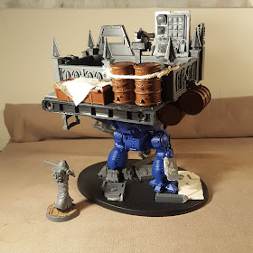 A transport junk-walker, based on 2/3 of a Primaris Redemptor Dreadnought (from Warhammer 40,000 Conquest magazine - I missed the issue with the other 1/3 of the kit!) with a platform added on top and lots of additional junk-armour and stowage. It isn't finished yet - I want to add more junk and stowage, and a lot of weathering texture paint and baking soda.